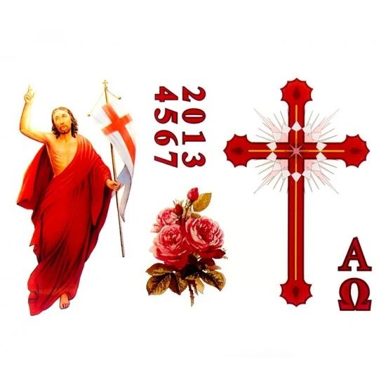 Adesivo per Cero Pasquale con la raffigurazione del Gesù Risorto nel modello classico. Fornito completo dei numeri per comporre l’anno in corso, una croce e le simbologie liturgiche. Può essere utlizzato sui ceri di cera o su quelli in plastica. Made in Italy