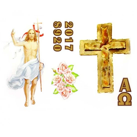 Adesivo per Cero Pasquale con la raffigurazione del Gesù Risorto e rose. Fornito completo dei numeri per comporre l’anno in corso, una croce e le simbologie liturgiche dell’alfa ed omega. Può essere utlizzato sui ceri di cera o su quelli in plastica. Made in Italy