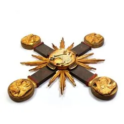 Agnello di Dio con 4 Evangelisti, prodotto realizzato interamente in legno di acero naturale che viene dipinto a mano con colori ad olio anticati ed impreziosito da una splendida croce con raggi rifiniti con falsa foglia oro brillante. Opera di pregevole fattura artigianale rifinita con grande cura in tutti i particolari. Made in Italy