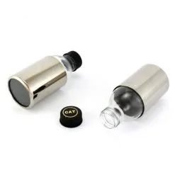Astuccio con 2 bottiglie per olio Santo (Catecumeni e Chrisma) da 125 cc realizzate in vetro corazzato in metallo nikelato e munite di tappo a vite in plastica di colore nero. Made in Italy