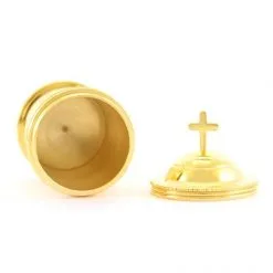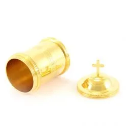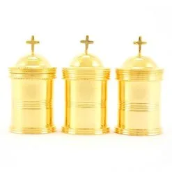 Astuccio con 3 vasetti per oli (Catecumeni, Crisma e Infermi) realizzati interamente in ottone dorato. Il tappo è decorato con una crocetta piatta ed ha un sistema di apertura sicuro e pratico con filettatura, svita e avvita. Prodotto eseguito con la massima cura per i particolari e fornito in elegante astuccio di velluto blu con fodera bianca interna e chiusura anteriore.