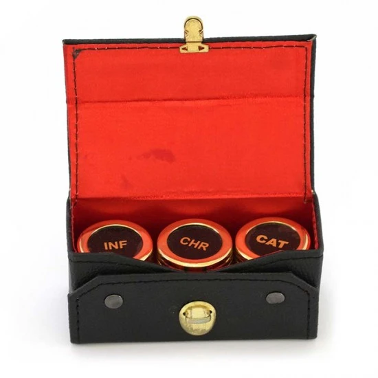 Astuccio con 3 vasetti per oli (Infermi, Crisma e Catecumeni) realizzato in colore nero con interno in tessuto rosso munito di chiusura. I vasetti sono realizzati in metallo dorato con interno in plastica e sistema di apertura sicuro e pratico con filettatura svita e avvita.
