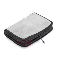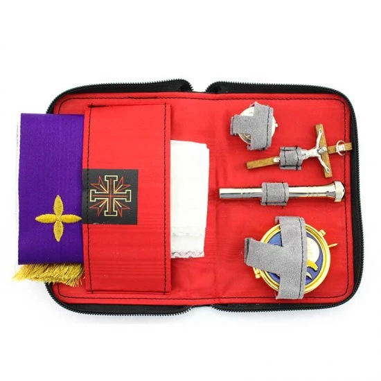 Astuccio per viatico scamosciato grigio e interno in tessuto rosso. L’astuccio è munito di chiusura lampo e contiene al suo interno questi oggetti: Asperges, Crocifisso, Teca smaltata, vasetto per oli sacri, piccola Stola e purificatoio. Tutti i prodotti sono realizzati con ottimi materiali e curati nei particolari. Made in Italy