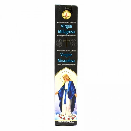 Bastoncini di incenso Vergine Miracolosa – Incenso religioso naturale arrotolato a mano di ottima qualità e gradevole profumazione, fornito confezionato in scatola di cartone decorata.