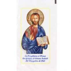Bustina per ulivo con frase e raffigurazione di Cristo. Realizzata in pvc leggero trasparente con comoda apertura superiore per consentire l’inserimento del rametto di ulivo. Inoltre porta un foro che permette di appendere comodamente la bustina al muro. Made in Italy