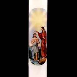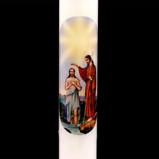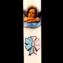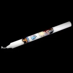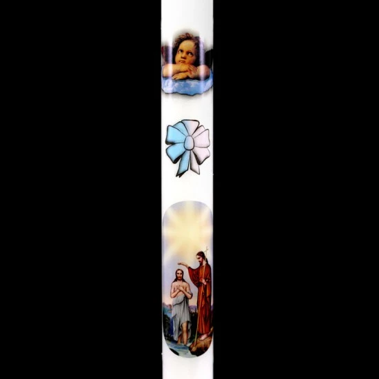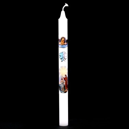 Candela in cera bianca con immagini adatte per Battesimo. Confezionata singolarmente con celophan trasparente. Made in Italy
