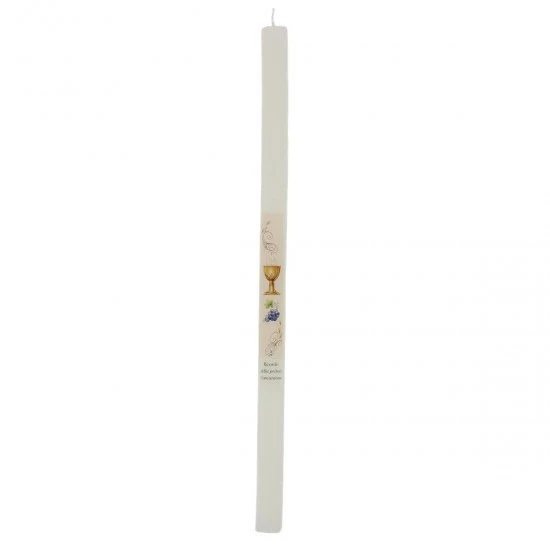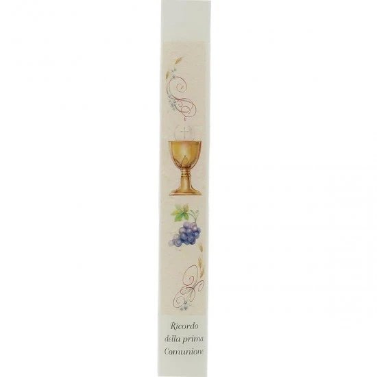 Candela in cera bianca con decalcomania di simboli Eucaristici (calice, uva, spighe) e scritta “Ricordo della Prima Comunione” confezionata in bustina di plastica trasparente. Made in Italy