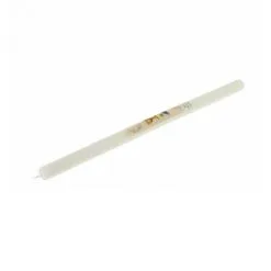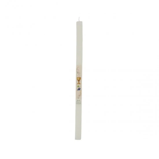 Candela in cera bianca con decalcomania di simboli Eucaristici (calice, uva, spighe) e scritta “Ricordo della Prima Comunione” confezionata in bustina di plastica trasparente. Made in Italy