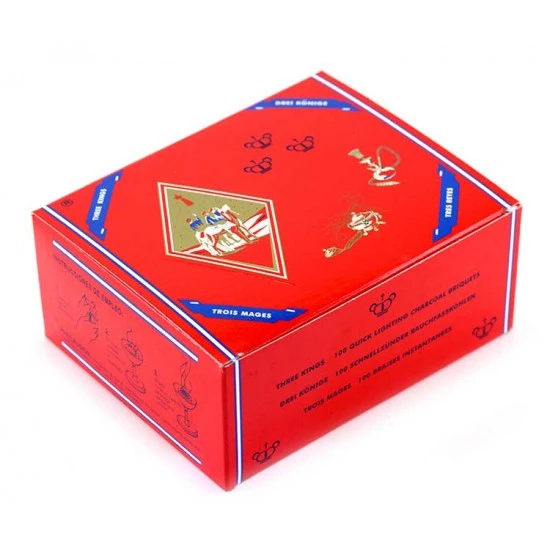 Carboncini per incensi Tre Magi, la scatola contiene 10 rotoli da 10 pellet di carbone (totale 100 compresse), confezionati ermeticamente in carta di alluminio per mantenerli isolati e intatti. La compressa è di forma incava molto utile per accogliere l’incenso, le resine e legni. Made in Holland