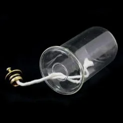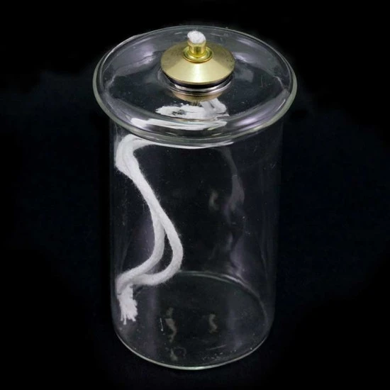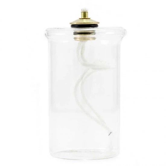 Cartuccia a cera liquida realizzata in pyrex, si adatta alle candele in plastica dal diametro 6 cm al 8 cm, fornita completa di gigler in ottone dorato e stoppino.