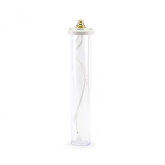 Cartuccia a cera liquida in policarbonato adatta alle candele dal diametro 4 cm, fornita di tappo con gigler e stoppino.