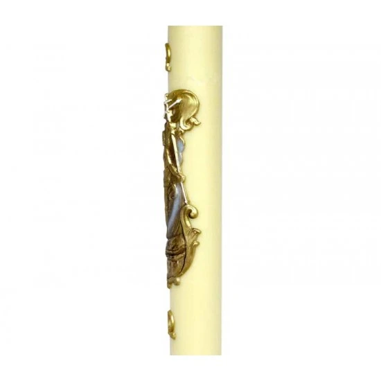 Cero Pasquale in cera d’api di primissima qualità realizzato con applicazioni del Gesù Risorto, alfa ed omega. Colorazione Gesù Risorto bronzato. Diffonde un delicato e gradevole profumo di miele. Made in Italy