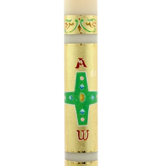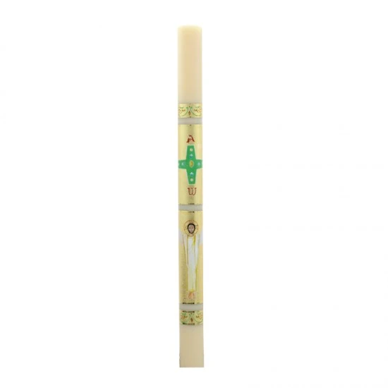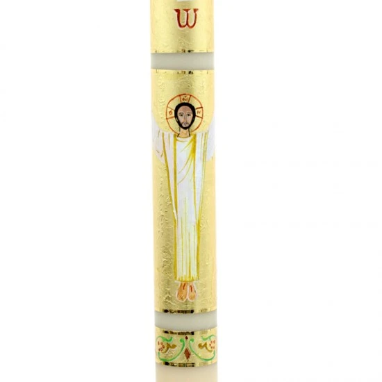 Cero Pasquale dipinto, realizzato in cera di primissima qualità che diffonde un delicato e gradevole profumo. Le diverse raffigurazioni presenti sul cero vengono interamente dipinte a mano, splendida la raffigurazione di Gesù Risorto. Dipinto eseguito da un artista che dipinge con molta dedizione ed amore ogni singolo pezzo. Made in Italy