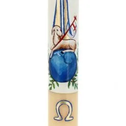 Cero Pasquale Agnello dipinto a mano, realizzato in cera d’api di primissima qualità che diffonde un delicato e gradevole profumo di miele. Le diverse raffiguarazioni presenti sul cero vengono interamente dipinte a mano, splendide le colorazioni celesti che danno un richiamo Mariano. Lavoro eseguito da un artista napoletano che dipinge con molta dedizione ed amore ogni singolo pezzo. Made in Italy