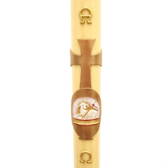 Cero Pasquale realizzato in cera d’api di primissima qualità che diffonde un delicato e gradevole profumo. Arricchito da decorazioni in cera a rilievo, Croce con agnello bianco e alfa e omega. Made in Italy