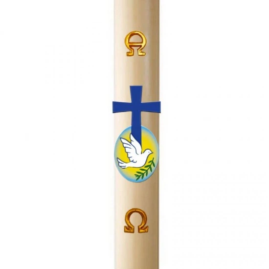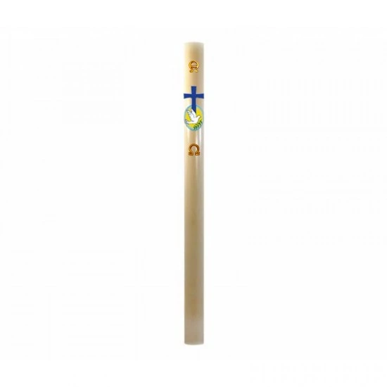 Cero Pasquale realizzato in cera d’api di primissima qualità che diffonde un delicato e gradevole profumo. Arricchito da decorazioni in cera a rilievo, Croce blu, colomba su sfondo giallo e ramoscello di ulivo. Made in Italy