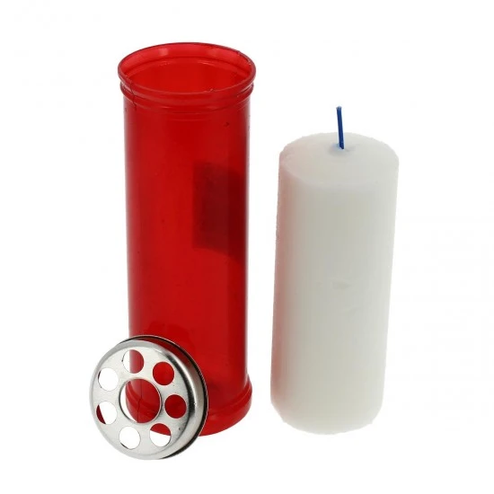 Cerone Liturgico in cera bianca con contenitore in plastica rossa. La durata di 140 ore (circa) è garantita dalla buona qualità della cera. Made in Italy