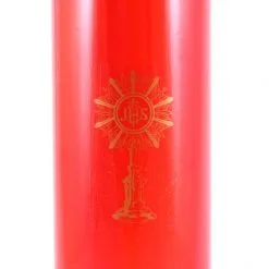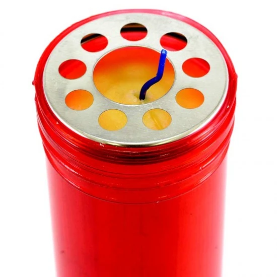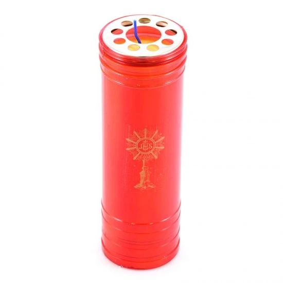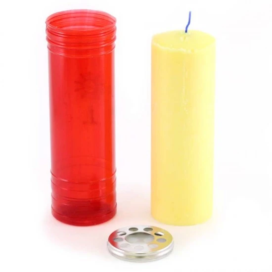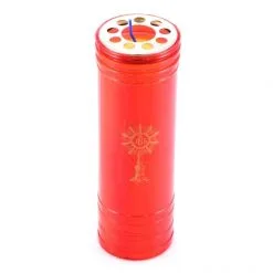 Cerone Liturgico, in cera gialla con contenitore in plastica rossa. La durata di 7 giorni (circa) è garantita dalla qualità della cera. Made in Italy