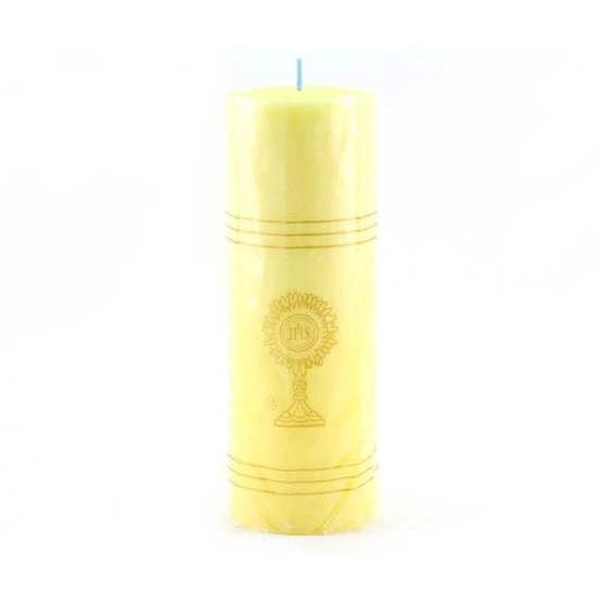 Cerone Liturgico in cera gialla confezionato in cellophane trasparente con Ostensorio stampato dorato. La buona qualità della cera è garanzia di un prodotto eccellente. Made in Italy