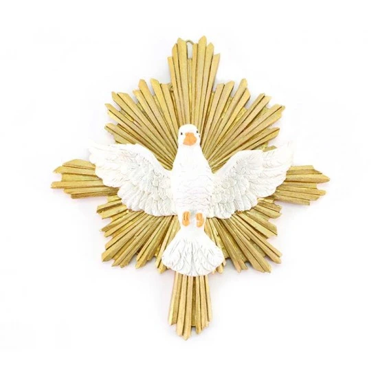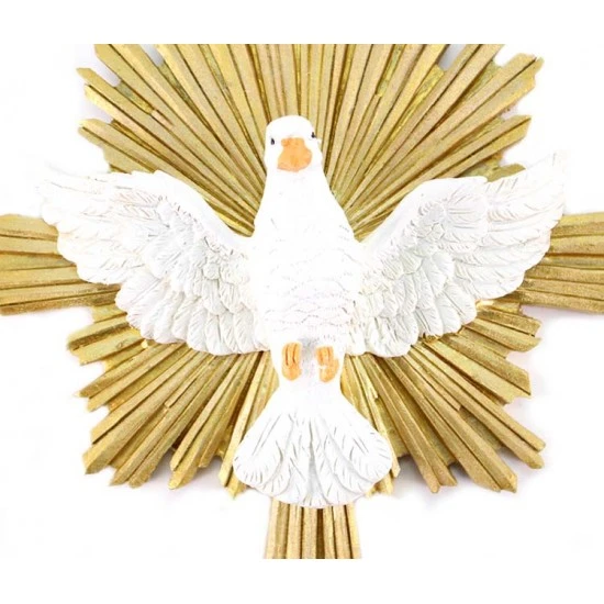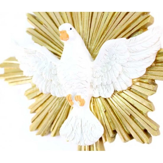 Colomba Spirito Santo realizzata interamente in resina colorata, impreziosita da una splendida raggiera ben rifinita. Quest’opera di pregevole fattura artigianale viene lavorata in un piccolo laboratorio dalla grande esperienza per le sculture sacre. Made in Italy