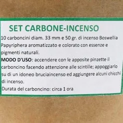 Confezione contenente 10 carboncini diametro 33 mm e 50 g di incenso pontificale derivato dalla pianta Boswellia Papyriphera aromatizzato e colorato con essenze e pigmenti naturali.