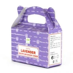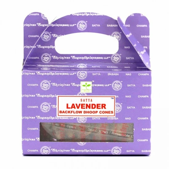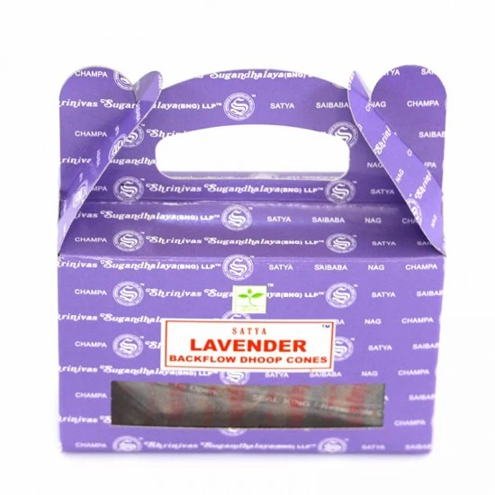 Coni di incenso a riflusso Satya di ottima qualità e gradevole profumazione alla lavanda. Confezionati in simpatica scatola di cartone colorata contenente 24 coni.