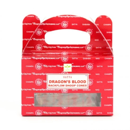 Coni di incenso a riflusso Satya di ottima qualità e gradevole profumazione Sangue di drago. Confezionati in simpatica scatola di cartone colorata contenente 24 coni.
