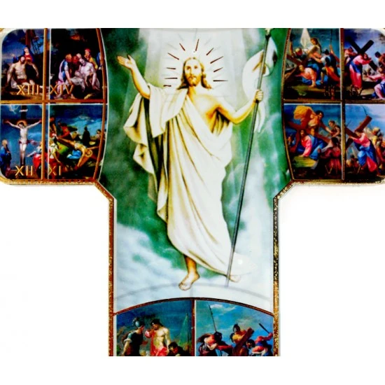 Croce in plexiglass con le raffigurazioni della Via Crucis e del Gesù Risorto rifinite da un elegante filo dorato. Confezionata in una scatola di cortoncino. Made in Italy