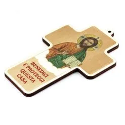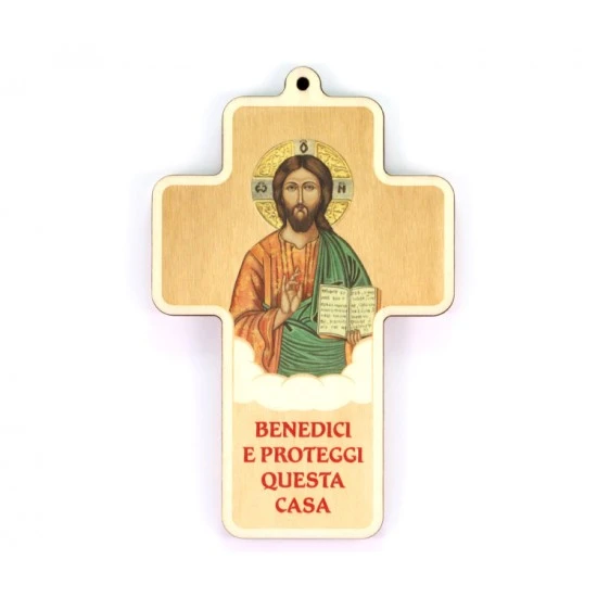 Croce in legno con raffigurazione di Cristo Pantocratore fornita completa di scatola litografata contenente la preghiera per la Benedizione della casa. Made in Italy