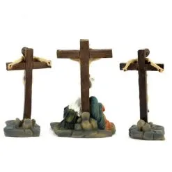 Crocifissione di Gesù. Scena raffigurante la Crocifissione di Gesù, realizzata interamente in resina colorata, composta da Gesù Crocifisso con i due ladroni. L’articolo è fornito completo di scatola litografata.