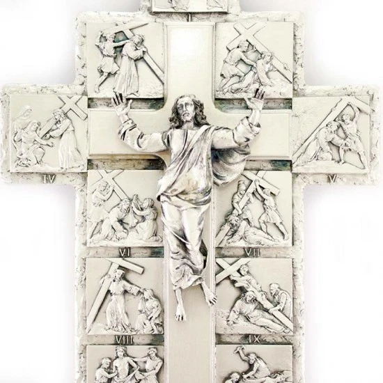Crocifisso con Via Crucis realizzato interamente in metallo argentato. Al centro del Crocifisso vi è Cristo Risorto attorniato dalle 14 stazioni della Via Crucis. Prodotto di ottima fattura e ben rifinito nei particolari confezionato in elegante scatola di cartone. Made in Italy