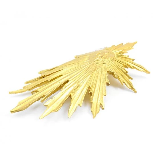 Decalcomania in cera dorata “IHS con raggi” per cero pasquale. Per essere applicata, questo tipo di decalcomania, va fissata direttamente sul cero con degli spilli riscaltati su fuoco. Made in Italy