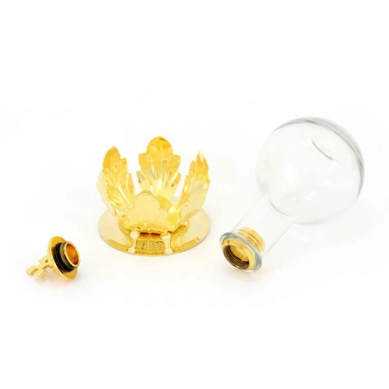 Fiaschetta per oli Santi in vetro con tappo a vite inserita su base in ottone dorato, capienza 100 cc. Made in Italy