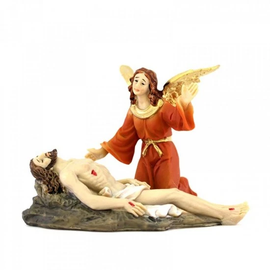 Scena raffigurante Gesù morto con angelo, realizzata interamente in resina colorata effetto legno. Prodotto di ottima fattura e ben rifinito nei particolari, fornito confezionato in scatola di cartone.