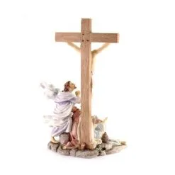 Gruppo Crocifissione di Gesù, scena realizzata interamente in resina piena colorata con colori molto tenui. Prodotto importato di ottima fattura e ben rifinito nei particolari. La statua è ben confezionata e corredata di elegante scatola.