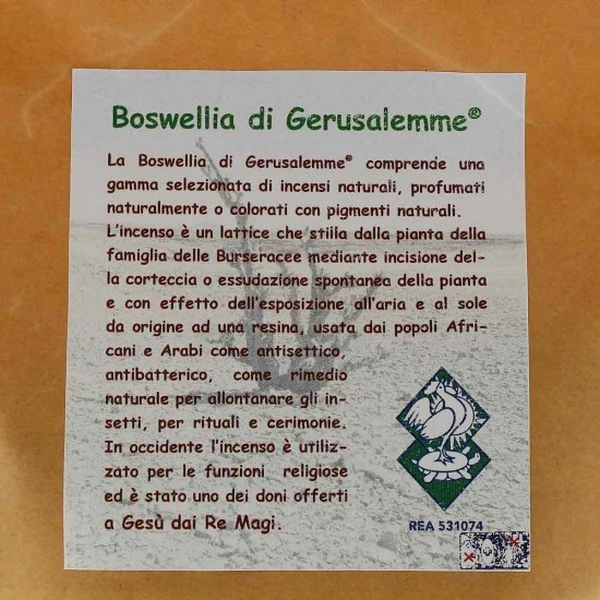 Incenso greco originale Boswellia di Gerusalemme Maydi. Incenso di alta qualità in grani grossi ed a sfoglie, gradevolissima la sua profumazione.