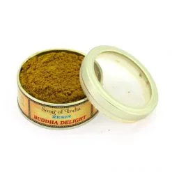 Incenso Budda Delight. Incenso resina in polvere di ottima qualità e gradevole profumazione, confezionato in barattolo di metallo molto utile per preservare il prodotto dall’umidità.