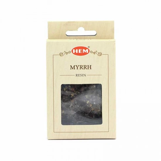Incenso Hem Mirra. Incenso in piccoli grani di ottima qualità e gradevole profumazione confezionato in scatola di cartone finestrato.