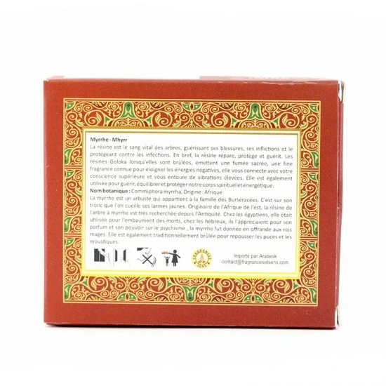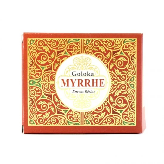 Incenso Mirra Goloka. Incenso in resina naturale, in piccoli grani di ottima qualità e gradevole profumazione confezionato in scatola di cartone decorato decorato.