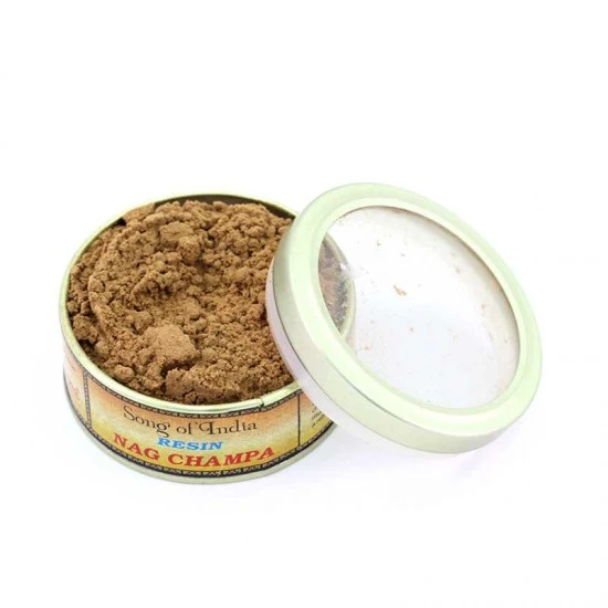 Incenso Nag Champa. Incenso resina in polvere di ottima qualità e gradevole profumazione, confezionato in barattolo di metallo molto utile per preservare il prodotto dall’umidità.