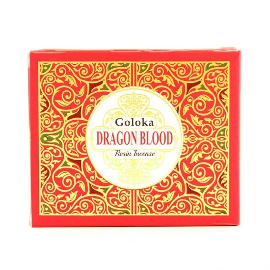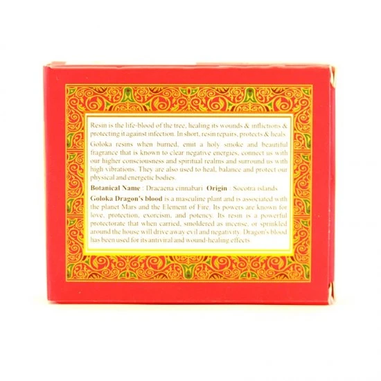 Incenso Sangue di Drago Goloka. Incenso in resina naturale, grani a pezzettoni di ottima qualità e gradevole profumazione confezionato in scatola di cartone decorato.