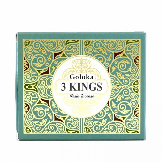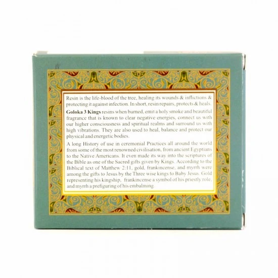 Incenso Tre Re Magi Goloka. Incenso in resina naturale in grani piccoli di ottima qualità e gradevole profumazione confezionato in scatola di cartone decorato.
