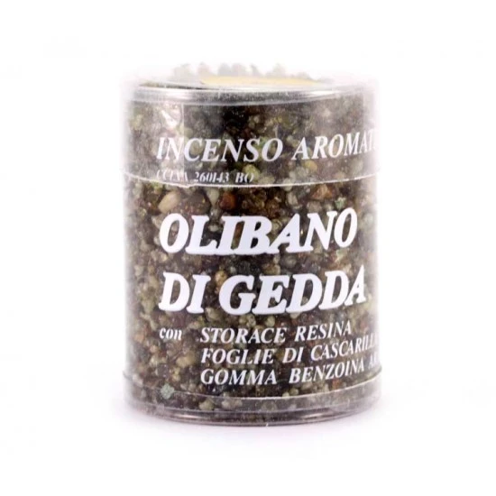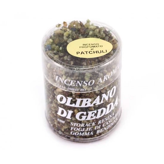 Incenso olibano di Gedda al patchouli. Di provenienza greca, questo tipo di incenso in granelli è di ottima qualità ed emana una gradevole e intensa profumazione. Confezionato in scatola trasparente.