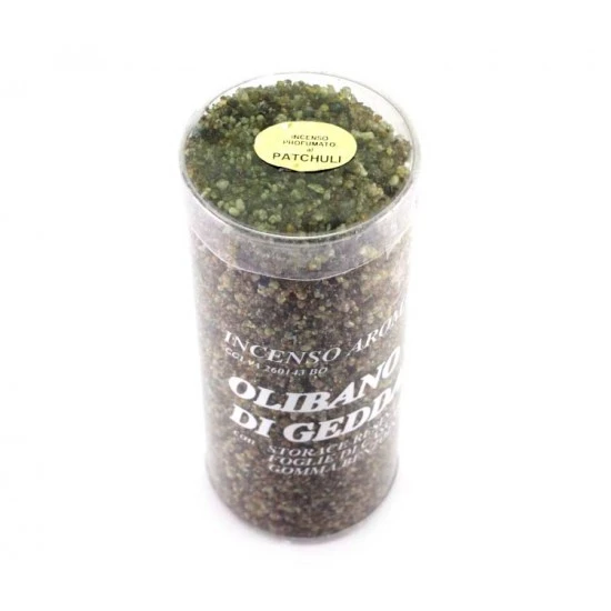 Incenso olibano di Gedda al patchouli. Di provenienza greca, questo tipo di incenso in granelli è di ottima qualità ed emana una gradevole e intensa profumazione. Confezionato in scatola trasparente.