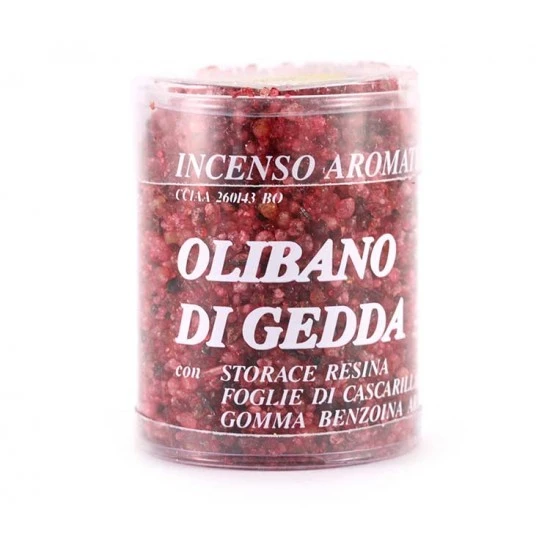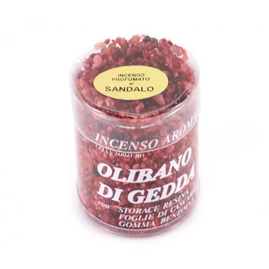 Incenso olibano di Gedda al sandalo. Di provenienza greca, questo tipo di incenso in granelli è di ottima qualità ed emana una gradevole e intensa profumazione. Confezionato in scatola trasparente.