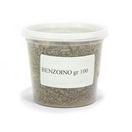 Incenso Benzoino una resina pregiata che emana una profumazione dolce e balsamica che ricorda la vaniglia. Viene confezionato in un barattolino di plastica sigillato.