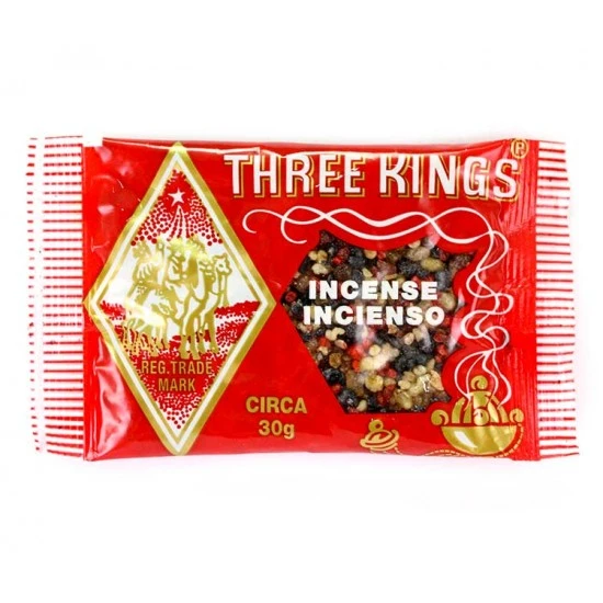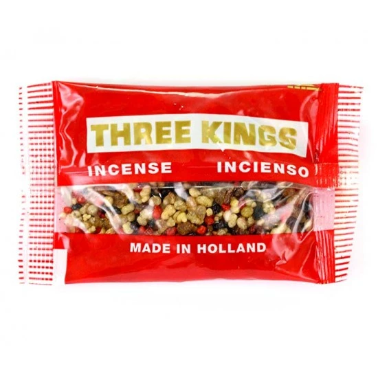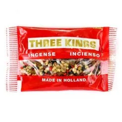 Incenso profumazione Tre Re Magi, questa miscela profumata contiene una ottima percentuale di resina naturale. Emana una profumazione dolce e gradevole. Confezionato in bustina di plastica colorata.