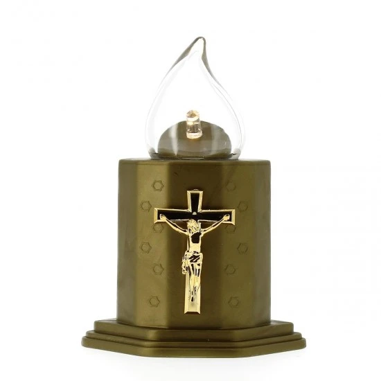 Lumino votivo elettronico realizzato in plastica color bronzo e decorato da crocifisso dorato sul fronte, luce led di colore giallo che simula l’effetto tremolante della fiamma della candela. Funziona con due batterie ministilo sostituibili (incluse) ed è munito di interruttore di spegnimento. Made in Italy