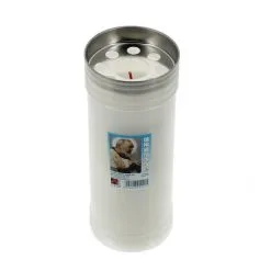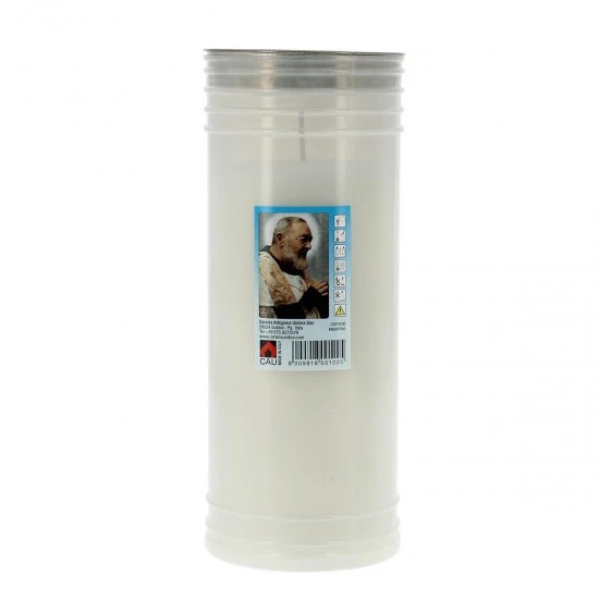 Lumino votivo in cera bianca con contenitore in plastica bianca e immagine di Padre Pio. La durata di circa 6 giorni è garantita dalla buona qualità della cera. Made in Italy