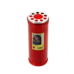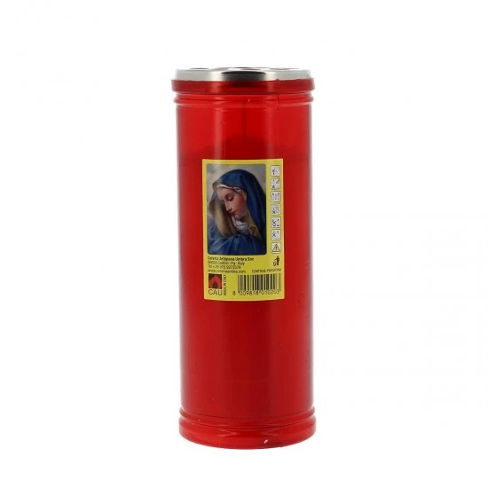 Lumino votivo in cera bianca con contenitore in plastica rosso e immagine della Madonna Addolorata. La durata di circa 96 ore è garantita dalla buona qualità della cera. Made in Italy